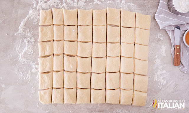 - Punch dough down and turn out onto a floured board. Roll dough into a rectangle, about 1” tall. Cut into 48 pieces, (6 rows cut into 8 rolls each). Place rolls on buttered cookie sheets about 1/2 - 1” apart. Cover and let rise until almost doubled in size, about 45-60 minutes.